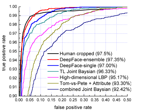 DeepFace在LFW数据集中进行人脸识别中取得了97.35%的好成绩,该成绩相对于传统方法中依靠人工显式的提取特征,再进行分类的method,识别准确性获得明显提高,再次证实了CNN在特征提取方面的威力,此外该成绩已经逼近人类在LFW数据集中97.5%的识别成绩,性能卓越。