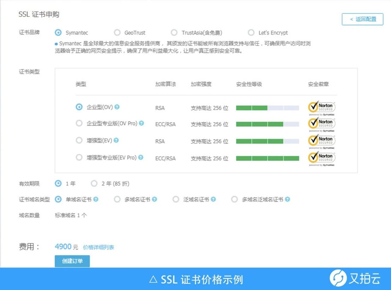 首先是证书价格问题,不少个人用户在看到价格之后,会产生“配置 HTTPS 是否值得”,“证书之间的价格相差如此之大我该如何选择”等疑问。这可能会使客户在了解 HTTPS 带来的好处之前,就直接打消配置 HTTPS 的念头。其实针对个人博客或者小网站,又拍云就提供 Let’s Encrypt 和 Symantec 的两款免费证书。 OV、EV 证书更建议企业采用,为网站提供更全面的安全保障。