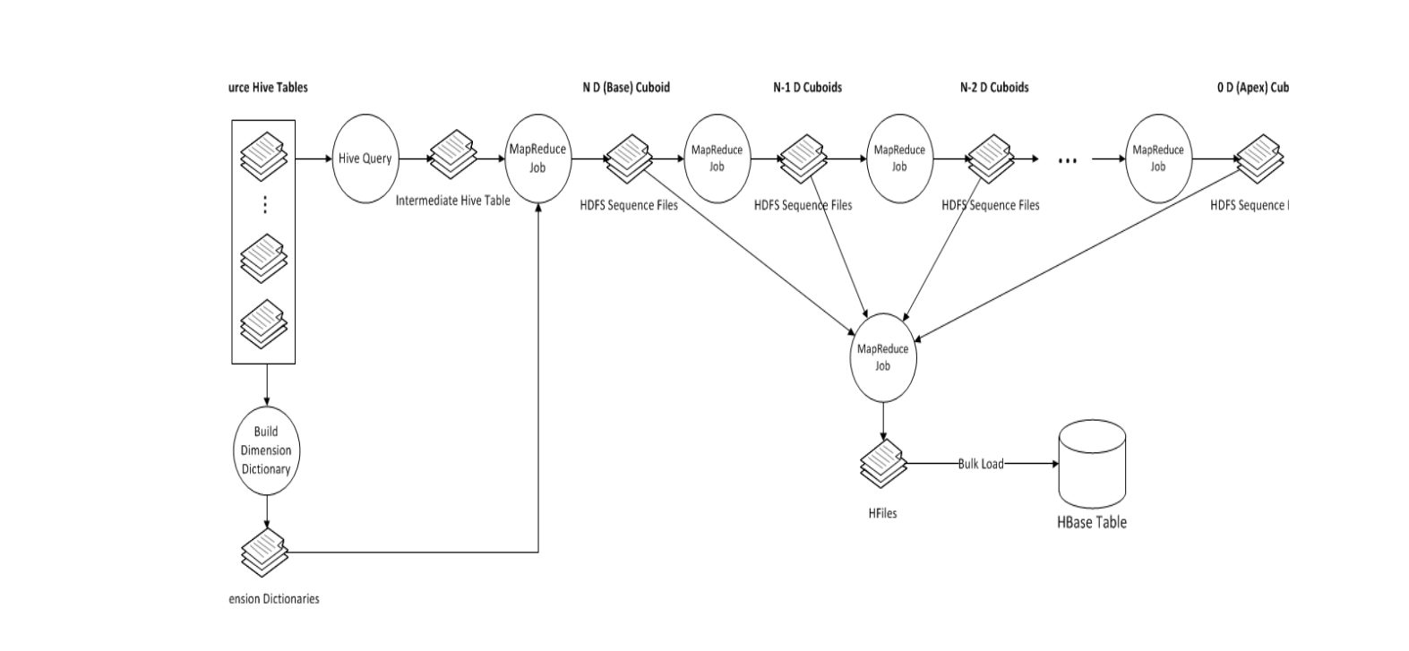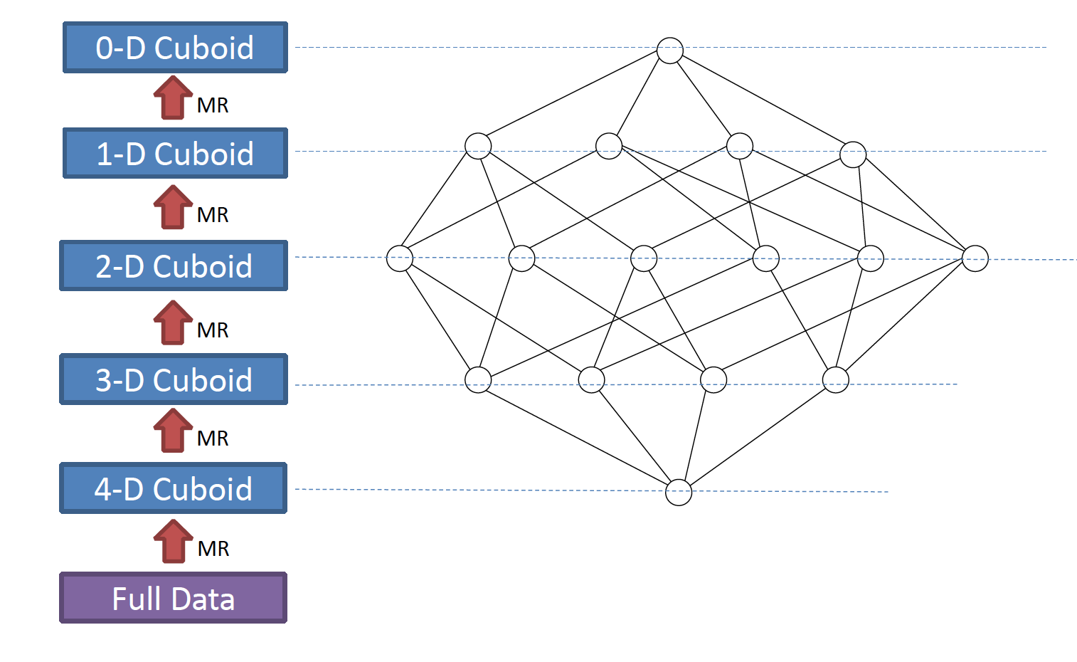 一个完整的数据立方体,由N-dimension立方体,N-1 dimension立方体,N-2维立方体,0 dimension立方体这样的层关系组成,除了N-dimension立方体,基于原数据计算,其他层的立方体可基于其父层的立方体计算。所以该算法的核心是N次顺序的MapReduce计算。