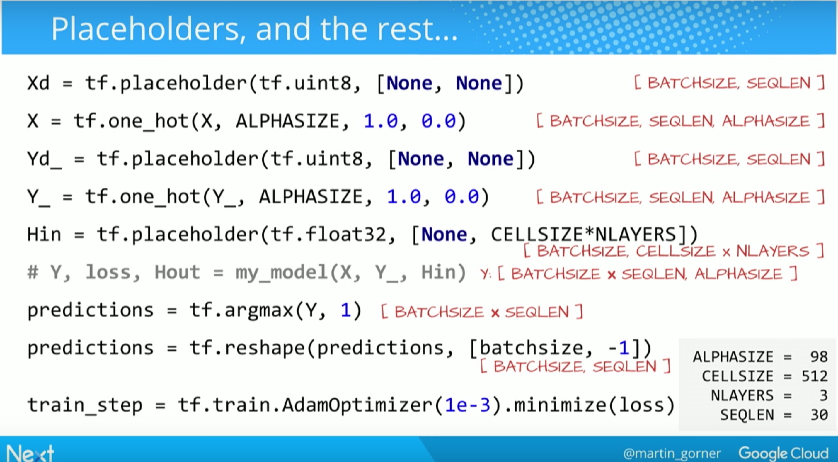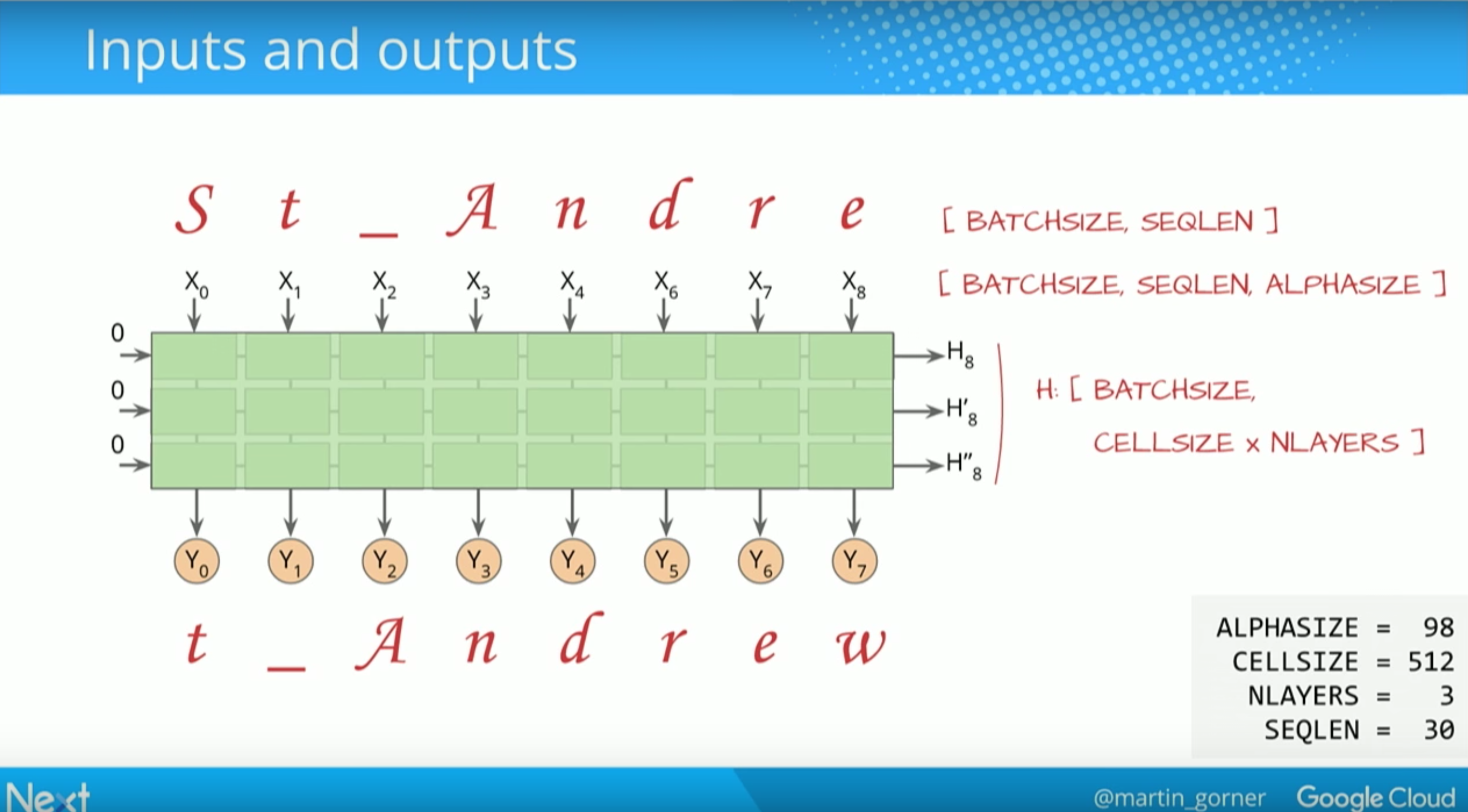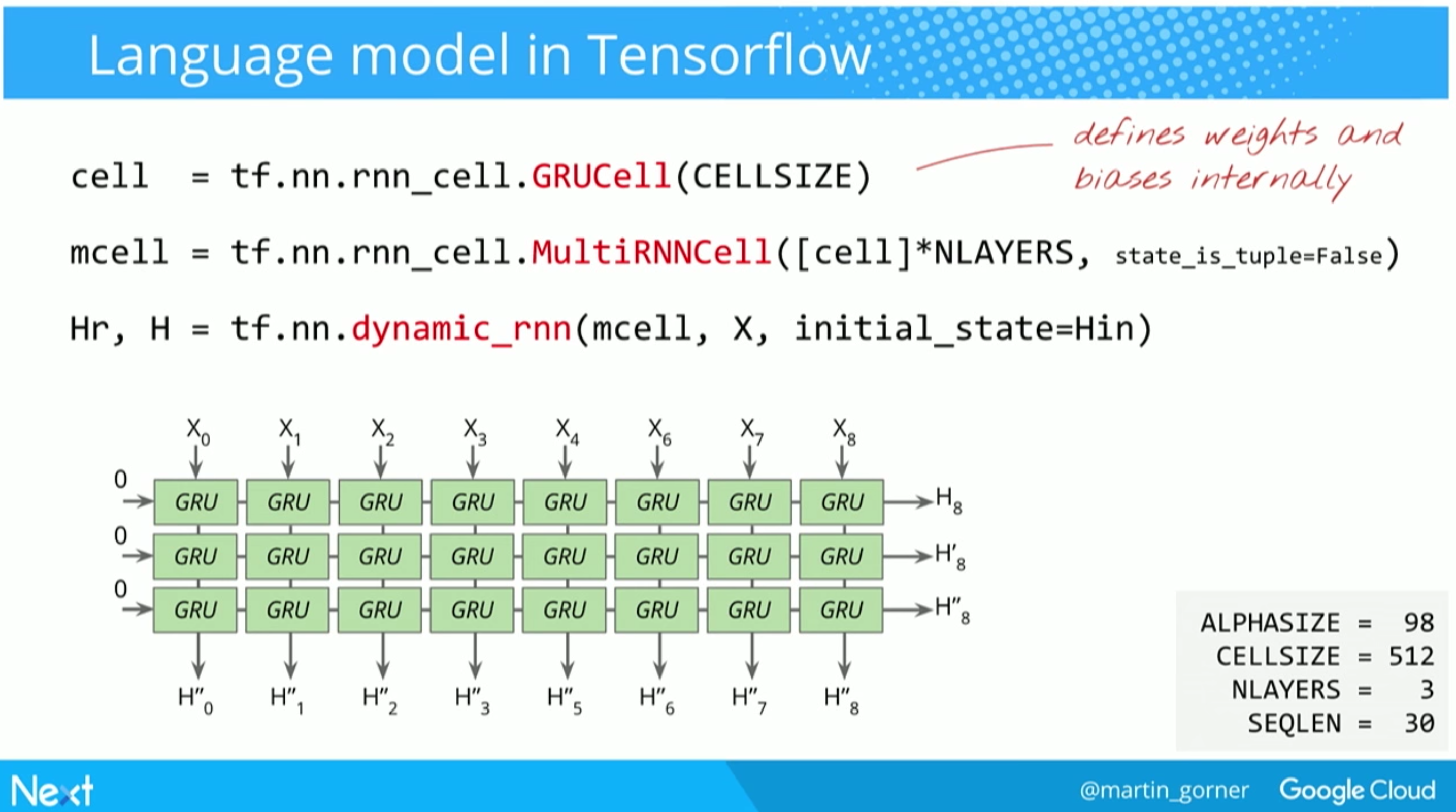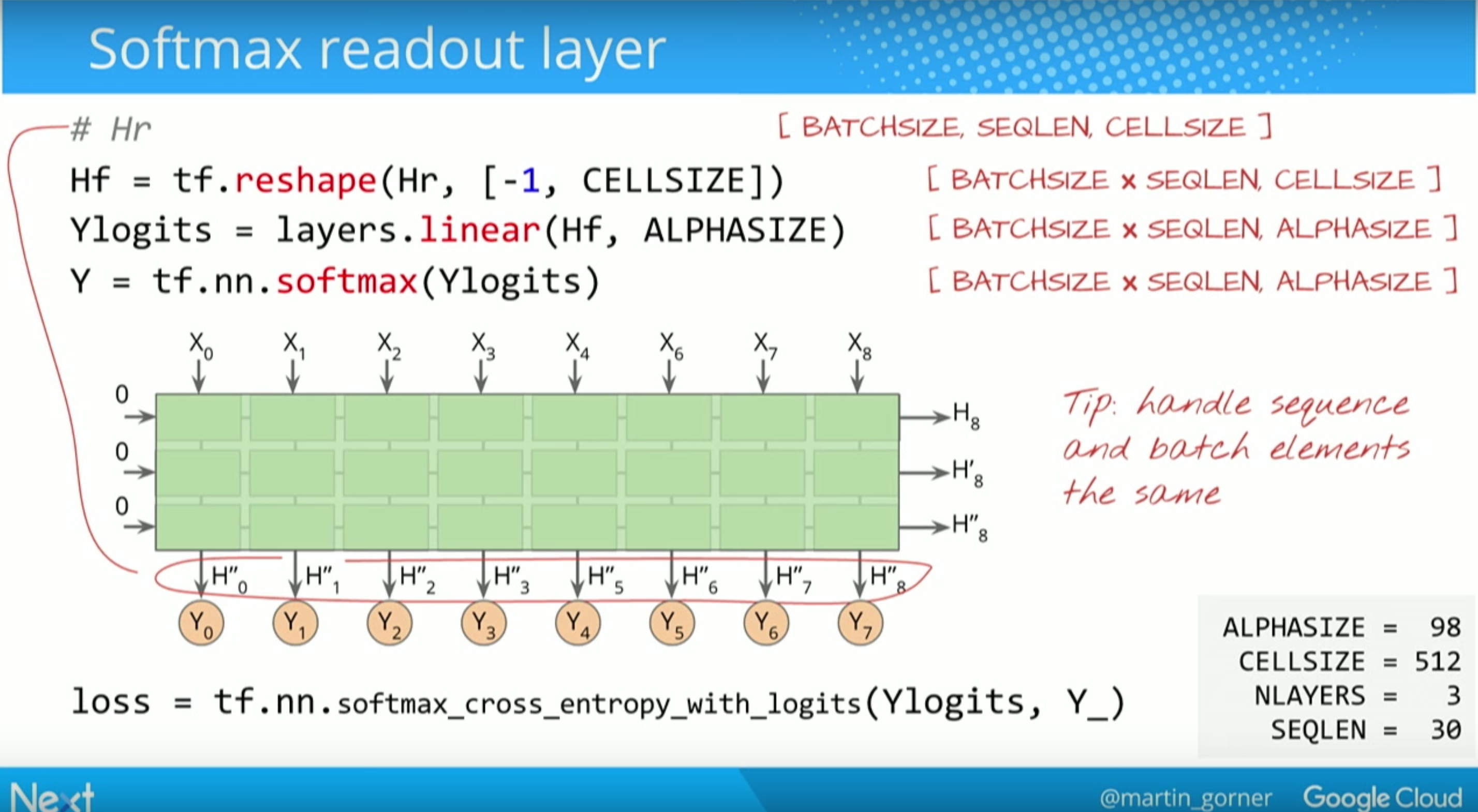 就行正确理解 RNN 的工作原理很难一样,向它们正确的输入数据也很难,你会发现里面里面有很多误差。接下来 Gorner 尝试了如何做出正确的输入、得到正确的输出。依此为例,他讲解了所选择的 batchsize、cellsize 和层(如下)。