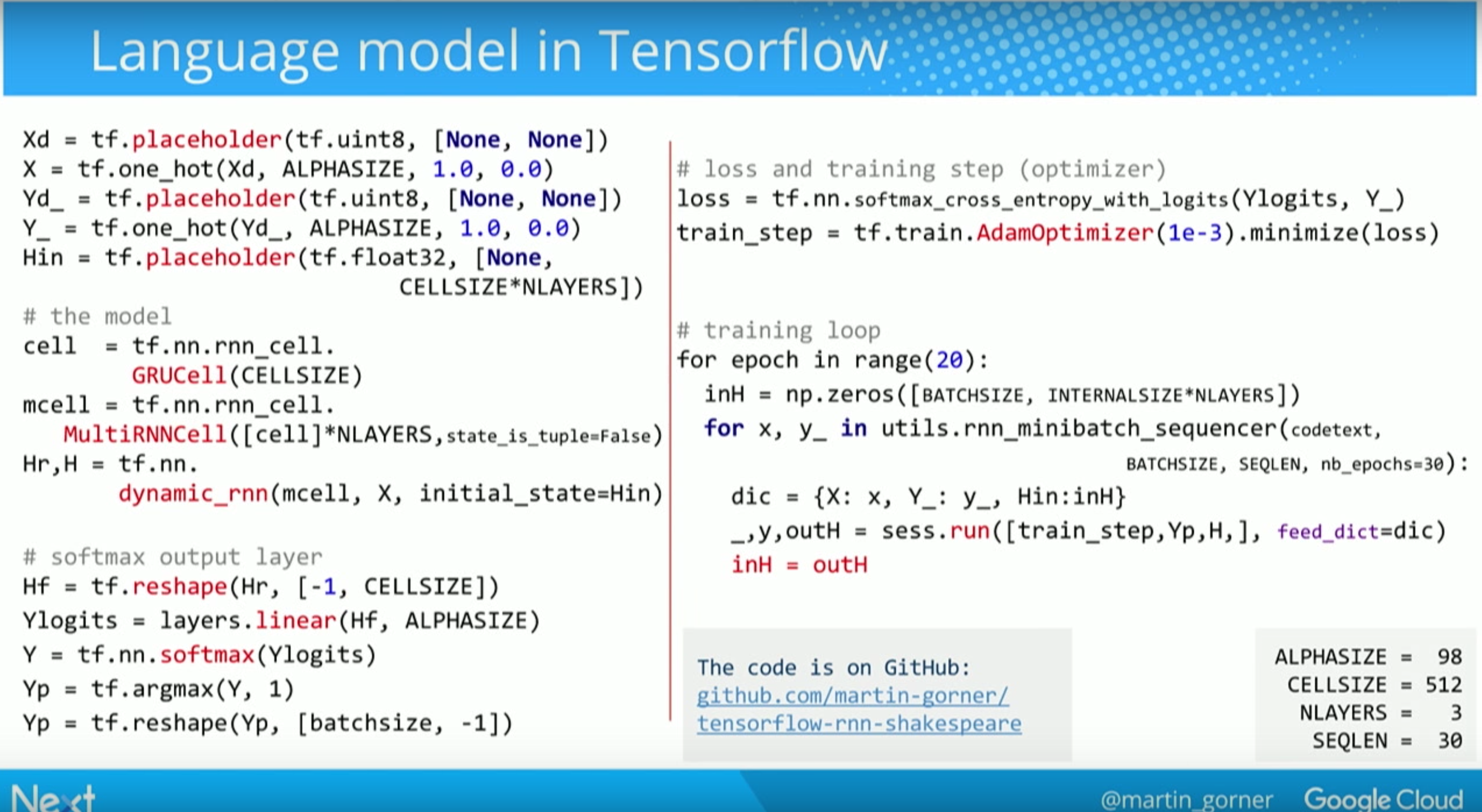 接下来就是如何用 TensorFlow 实现语言模型的循环神经网络了。在教授语言模型预测单词的下一个字符是什么的例子中,Gorner 使用了 TensorFlow 中更高等级的 API。图中的 GRUCell 有着多层的循环神经网络层、两个门。然后把网络做的更深,3 个 GRU 堆叠在一起。接下来,展开整个网络,在 TensorFlow 中,这被称为动态 RNN 功能。最终得到如下结果。