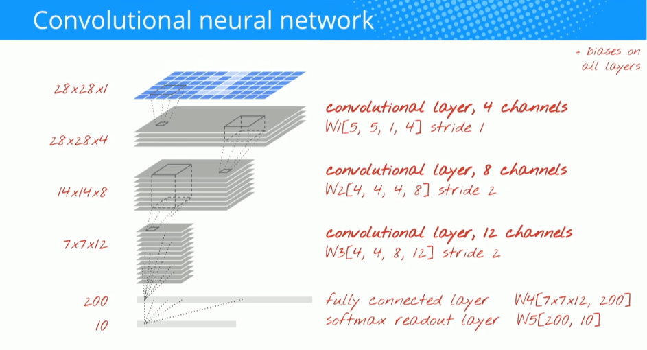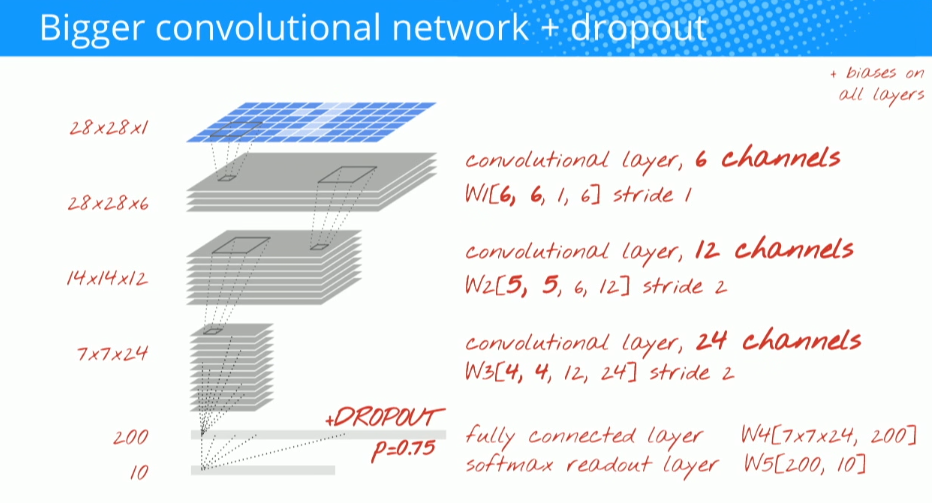 注意,第二与第三卷积层神经元数量以 2x2 为倍数减少,这就解释了为什么它们的输出值从 28x28 减少为 14x14,然后再到 7x7。卷积层的大小变化使神经元的数量在每层下降约为:28x28x14≈3000->14x14x8≈1500 → 7x7x12≈500 → 200。下一节中,我们将给出该网络的具体实现。