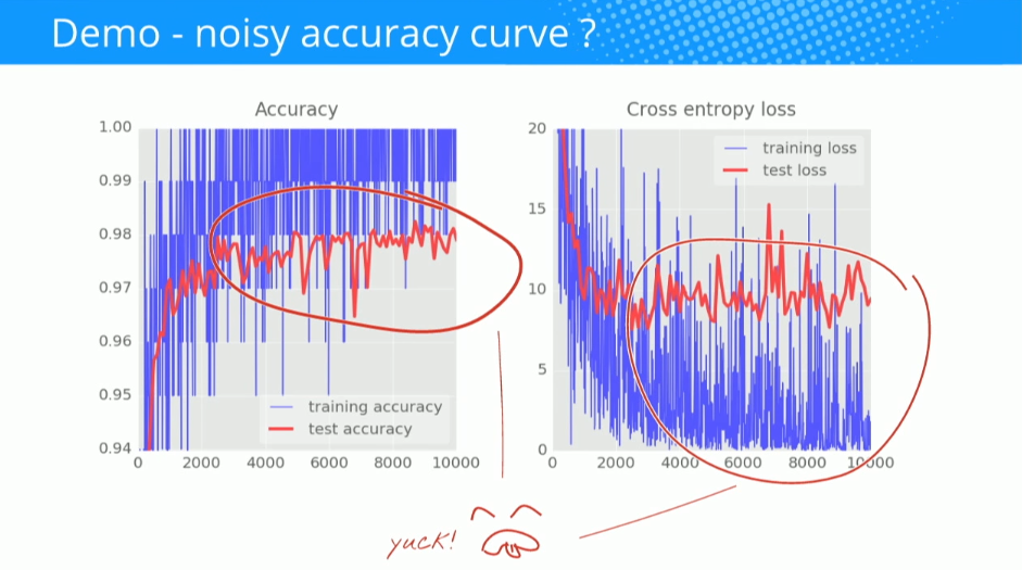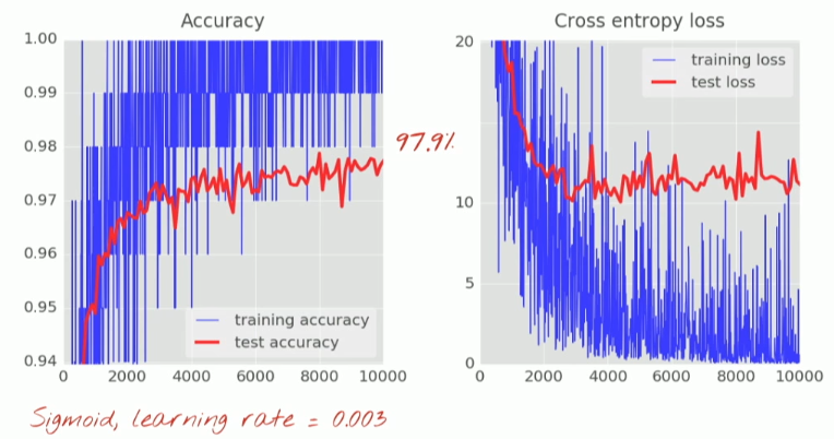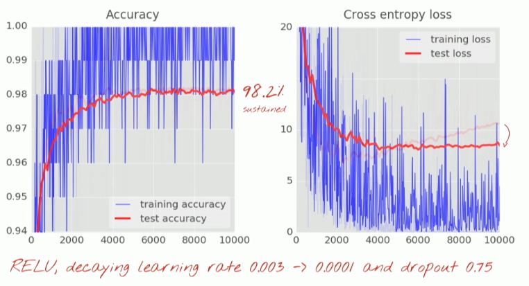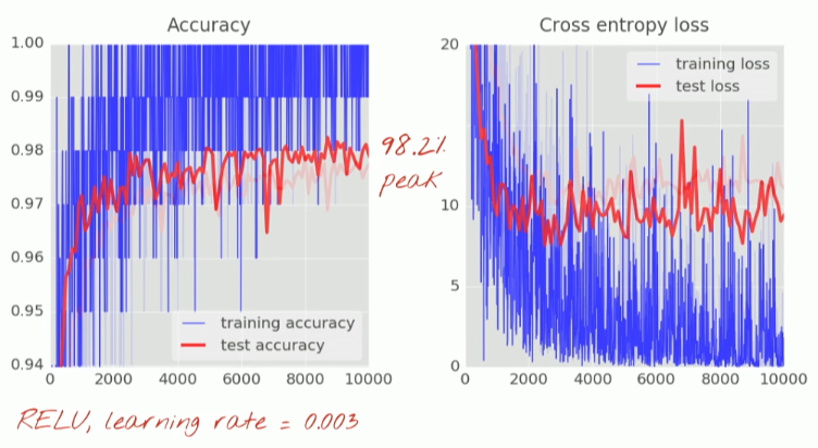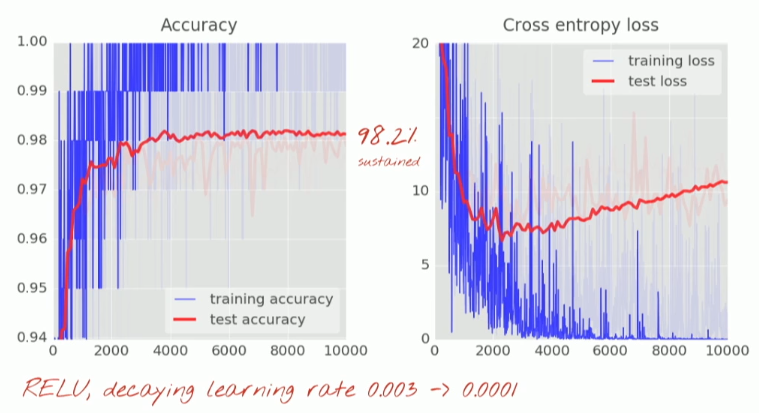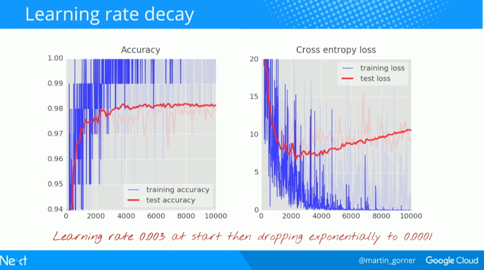 这些曲线很嘈杂,看看测试精确度吧:它在全百分比范围内跳上跳下。这意味着即使 0.003 的学习率我们还是太快了。但我们不能仅仅将学习率除以十或者永远不停地做训练。一个好的解决方案是开始很快随后将学习速率指数级衰减至比如说 0.0001。