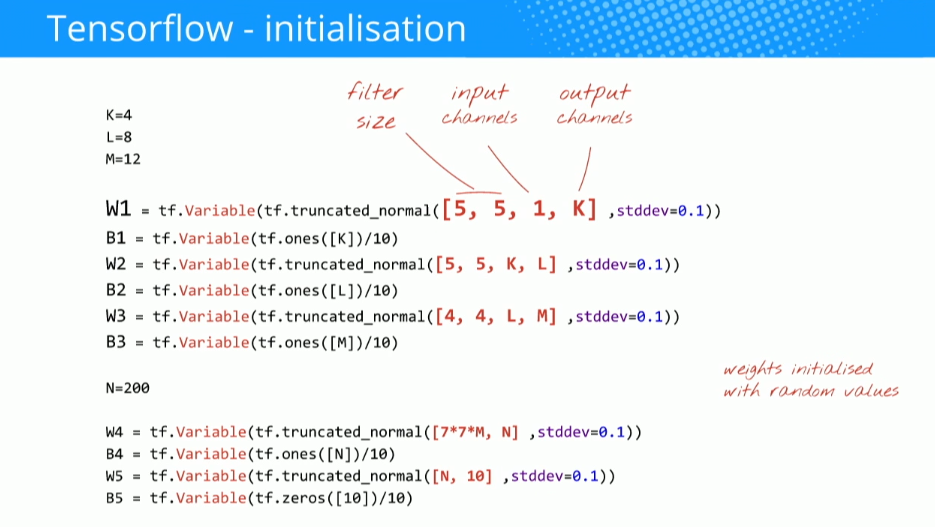 我们首先定义 TensorFlow 的变量和占位符(placeholder),即权重和偏置。