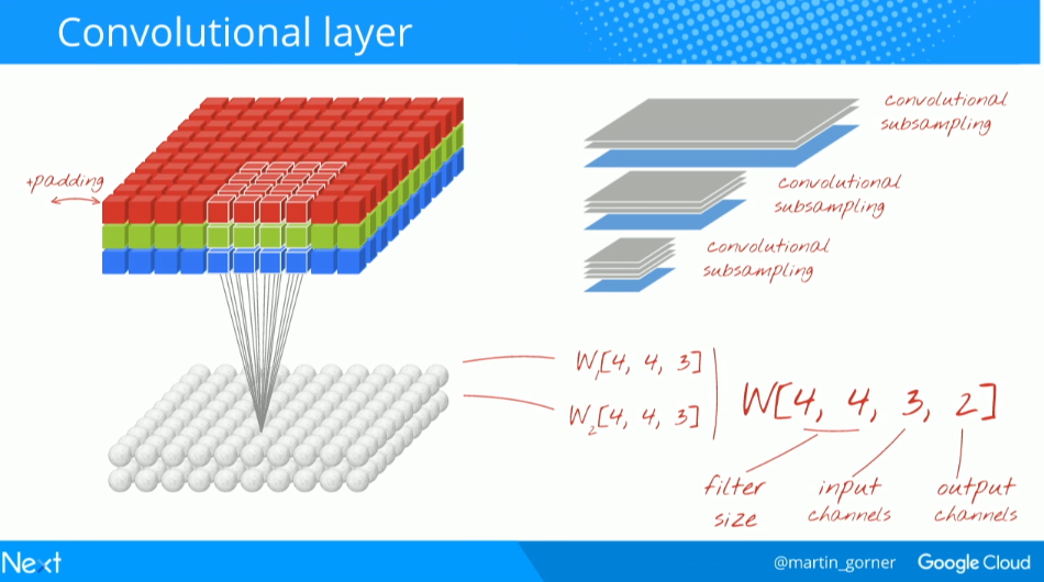 在 TensorFlow 中,使用 tf.nn.conv2d 函数实现卷积层,该函数使用提供的权重在两个方向上扫描输入图片。这仅仅是神经元的加权和部分,你需要添加偏置单元并将加权和提供给激活函数。不要过分在意 stride 的复杂语法,查阅文档就能获取完整的详细信息。这里的填充(padding)策略是为了复制图片的边缘的像素。所有的数字都在一个统一的背景下,所以这仅仅是扩展了背景,并且不应该添加不需要的任何样式。