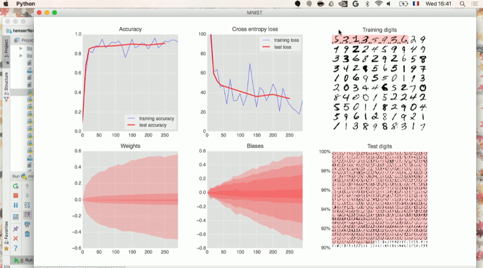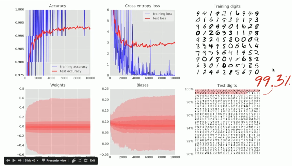 通过在馈送 dictionary 中提供测试而不是训练数据,可以对测试数据进行同样的计算(例如每 100 次迭代计算一次。有 10,000 个测试数字,所以会耗费 CPU 一些时间)。