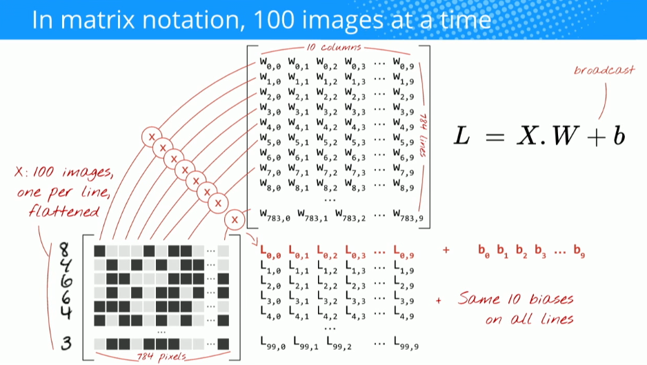 我们现在将使用矩阵乘法将这个单层的神经元的行为总结进一个简单的公式当中。让我们直接这样做:100 个图像的「mini-batch」作为输入,产生 100 个预测(10 元素向量)作为输出。