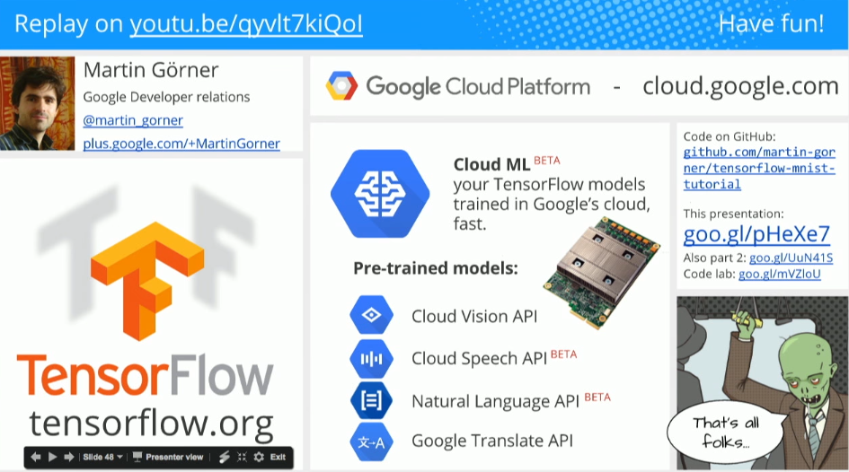 主题介绍:使用 TensorFlow,可以将深度机器学习从一个研究领域转变成一个主流的软件工程方法。在这个视频中,Martin Görner 演示了如何构建和训练一个用于识别手写数字的神经网络。在这个过程中,他将描述一些在神经网络设计中所使用的权衡技巧,最后他将使得其模型的识别准确度超过 99%。本教程的内容适用于各种水平的软件开发者。即使是经验丰富的机器学习爱好者,本视频也能通过卷积网络等已知的模型来带你了解 TensorFlow。这是一个技术密集的视频,是为想要快速上手机器学习的初学者而设计的。