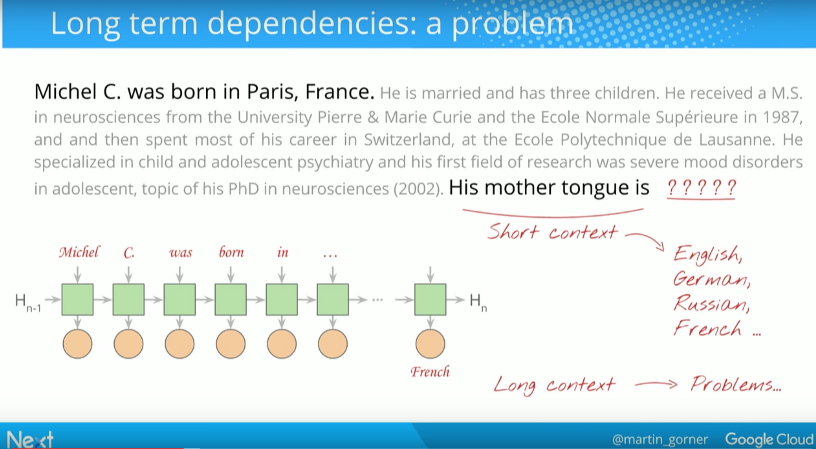 而后,Gorner 以句子为例讲解了如何使用 TensorFlow 建立循环神经网络。在以下示例中,我们是用单词而非字符作为输入,建立这样的模型中就有一个典型的问题:长期依存关系。而要把下面的长句输入,需要非常深的循环神经网络,而如果网络太深,训练时候又不太好收敛。在数学细节上要提到的就是梯度消失的问题,梯度成 0 了。