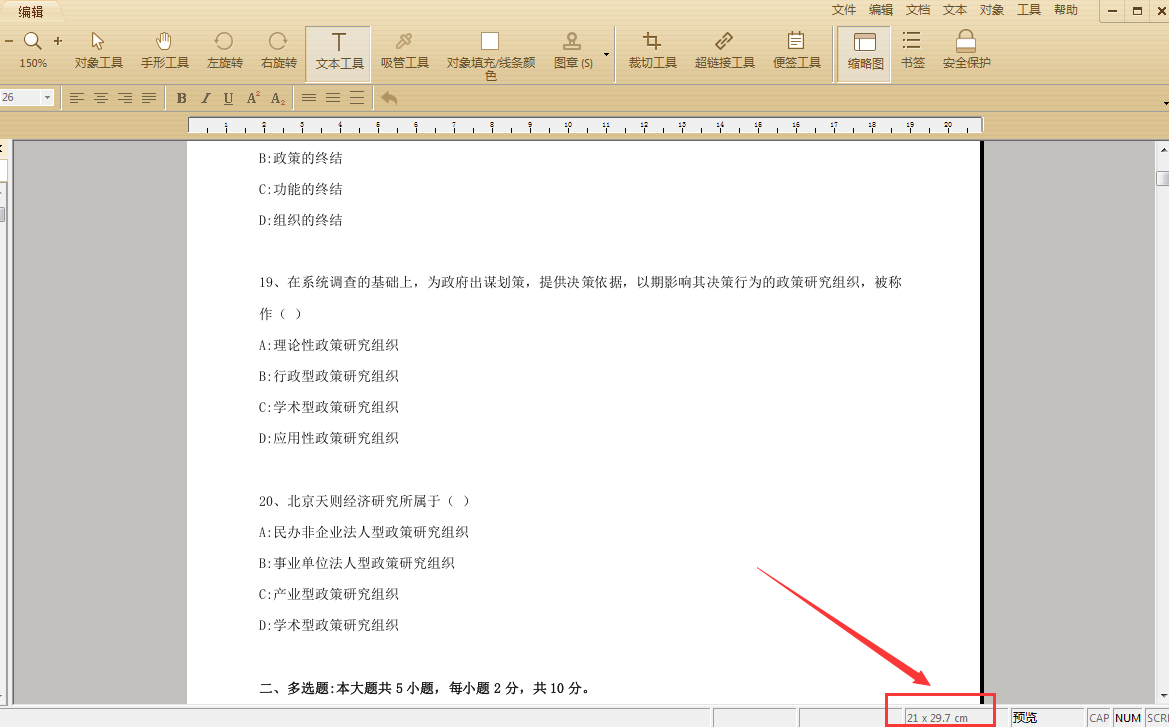 首先用极速PDF编辑器打开PDF文档后,在软件页面右下角有一个数字就是此时文档页面的尺寸大小,如图21X29.7就是常用的A4大小实际尺寸了。