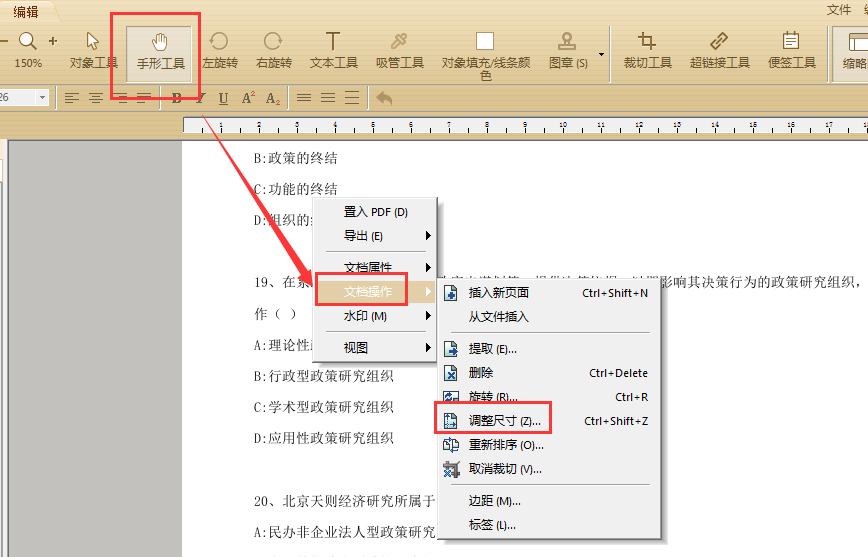 如果需要修改页面尺寸,可以先选择上方工具栏中的“手形工具”后,再在文档页面任意处右击并选择“文档操作”中的“调整尺寸”进入下一步操作。