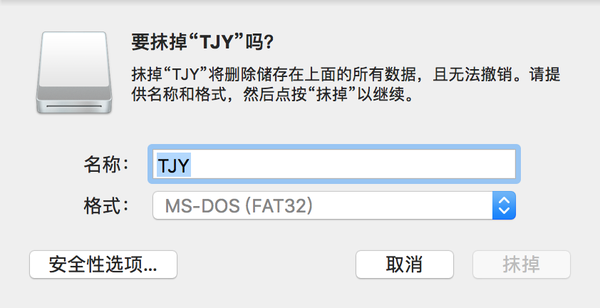 点击格式选择MS-DOS(FAT)选项后点击抹掉即可格式化U盘