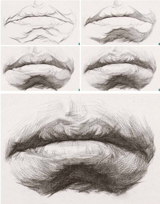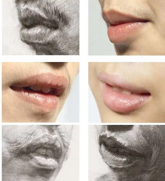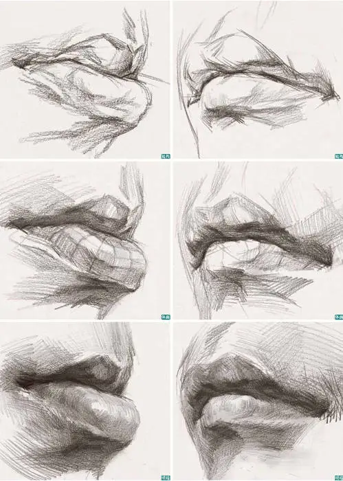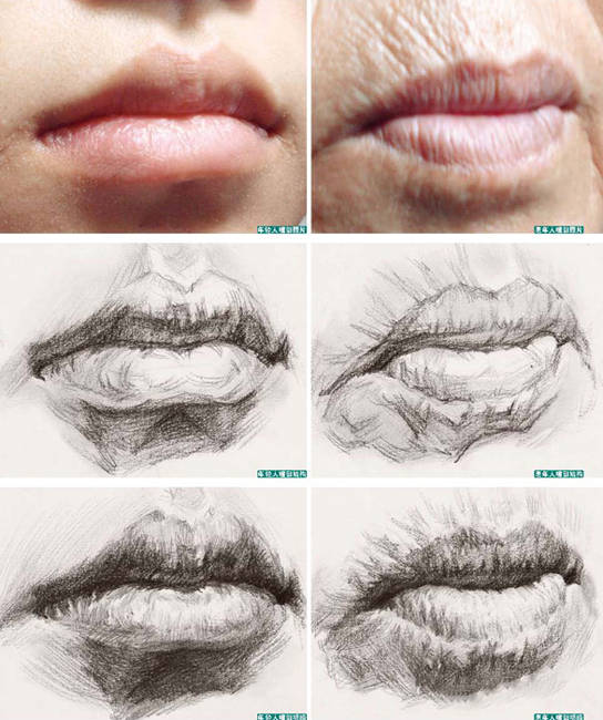 1 . 因为嘴部在横向上是一个半圆柱体的感觉, 所以在表现时要尽量画出中间嘴唇实、两侧嘴角虚的感觉。同时,从表现手法上来讲, 嘴部的中间部位可以用一些相对较清晰的线条顺着形体的方向排线, 然后将嘴角部分的线条揉虚, 这样一来, 实的东西往前走, 虚的东西往后退, 嘴部形体的空间感自然就加强了 。