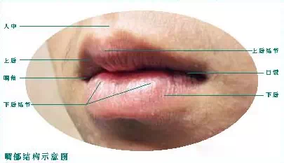 嘴部被分为上、下唇、口裂、唇结节、嘴角和人中等部分。(下图)