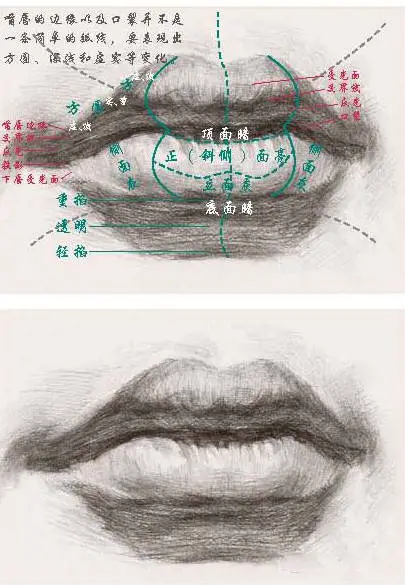 嘴角: 嘴部与脸部衔接中非常重要的部位, 表现时注意由嘴角处穿过嘴唇边缘相交处在形体上形成的明暗关系, 它是嘴部表现过程中非常重要的一个细节。