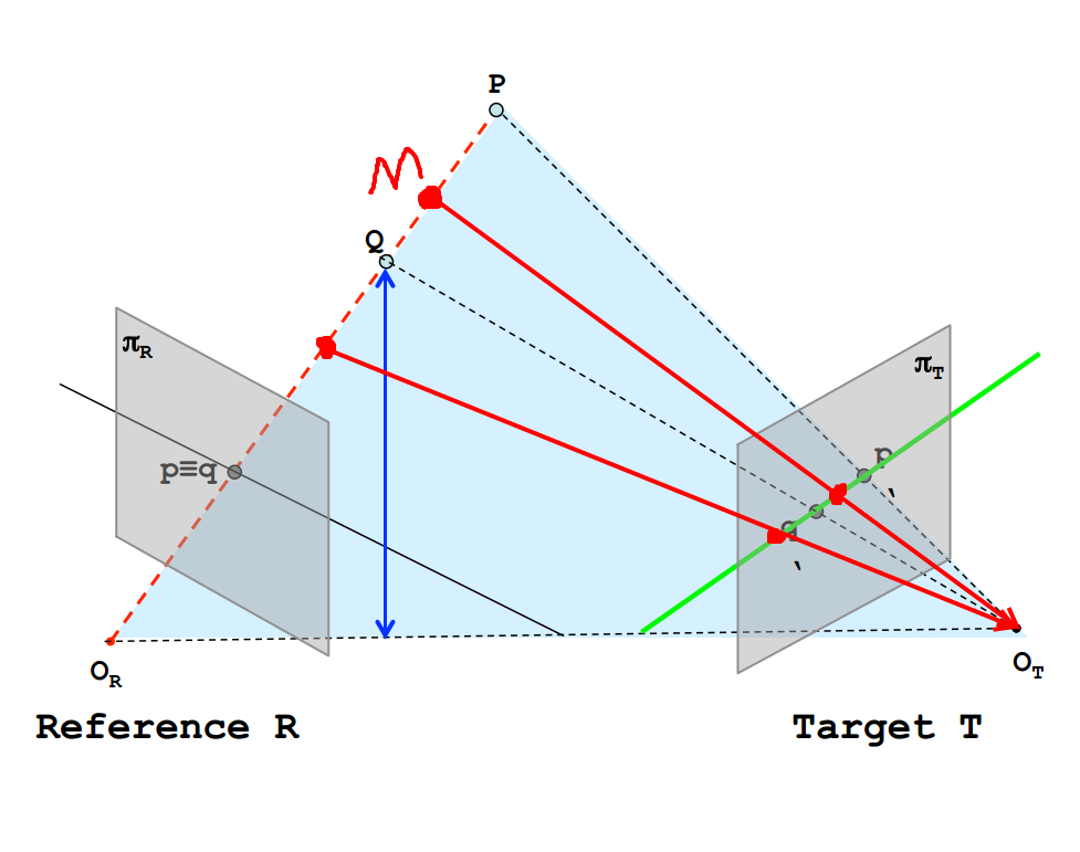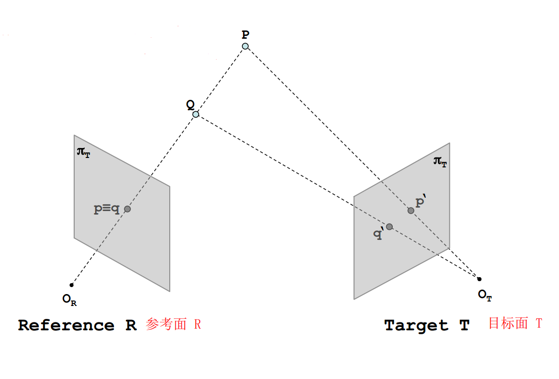 从图中可以很明显的看出,在增加了一个摄像头之后,P与Q在目标面T上的成像不在位于同一个点,而是有自己分别的成像点,也就是 与