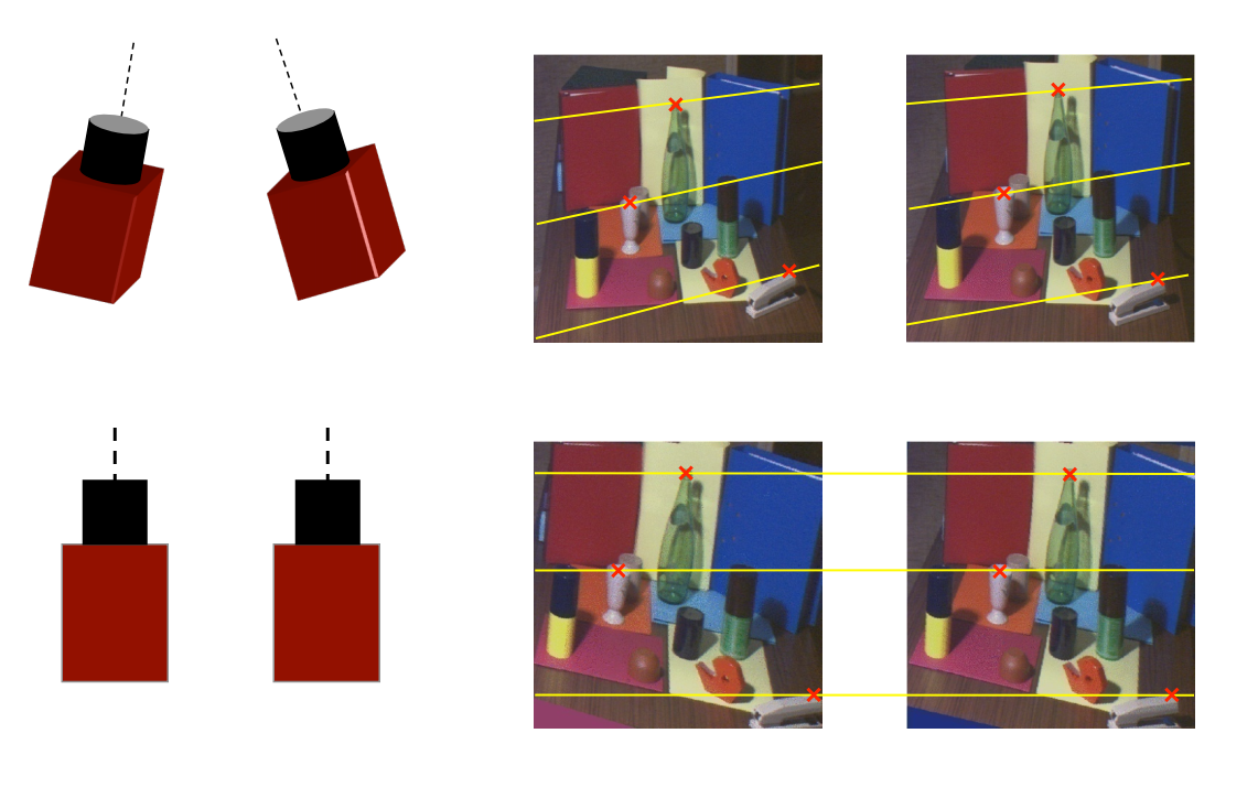 一旦我们知道了对应点的搜索区域,就可以将其从2D降到1D,这样就形成了更加方便的立体视觉,对应点都被约束再同一条极线上,也就是图中的y直线。下面给出一个实际的示例(在理想情况下,我们希望两个摄像头的参数是完全一致的,并且两个相机的位置是平行的)。