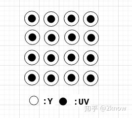 其中实心黑圈作为整体表示UV分量,空心圈表示Y分量;所以每一个Y拥有一组UV分量。需要注意的是,这仅仅是示意图,表示采样方式,不表示数据的真是存储方式。444可以理解为第一行Y和UV的比是4(第一个4):4(第二个4);第二行Y和UV的比是4(第一个4):4(第三个4);因此使用YUV444表示这种采样方式。这也表示水平采样是4:4;垂直采样是4:4.