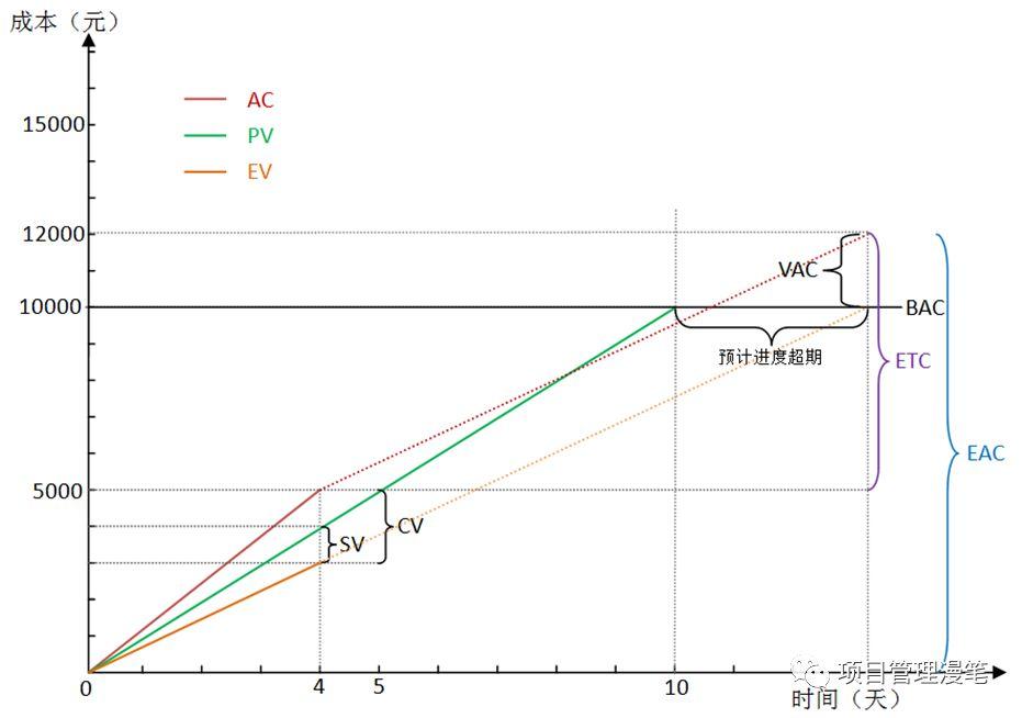从图中可以看到,AC线是在4天内实线的基础上延伸的虚线(实线表示实际值,虚线表示预测值),直接延伸表示花钱的速度不变(因为斜率没变)跟以前保持一致。这种情况下可以看到当EV达到BAC的时候(表示做了10000元的事项目做完了),AC的值是16667元,这个就是预测的最终项目完工的时候将会一共花这么多钱,也就是EAC,其与BAC的差额就是完工偏差VAC。