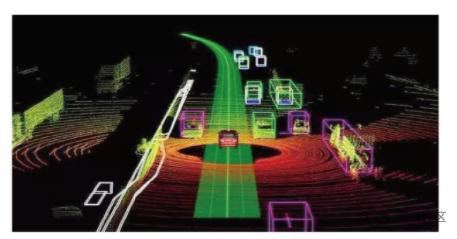 摄像头相当于人类驾驶员的眼睛,主要用于获取图像信息,可用于识别行人、车、树、红绿灯、交通标志等物体,以便进行定位。相比之下,激光雷达通过接收的反射数据,可以获取更加丰富而准确的信息,如目标距离、方位、高度、速度、姿态、甚至形状等参数,从而对目标进行探测、跟踪和识别以及更加准确的定位,其三维测距原理是通过测量激光信号的时间差、相位差确定距离,通过水平旋转扫描测角度,并根据这两个数据建立二维的极坐标系,再通过获取不同俯仰角度的信号获得第三维的高度信息。激光获取的数据信息经过识别分类标注不同颜色处理后得到的可视化信息如图2所示。
