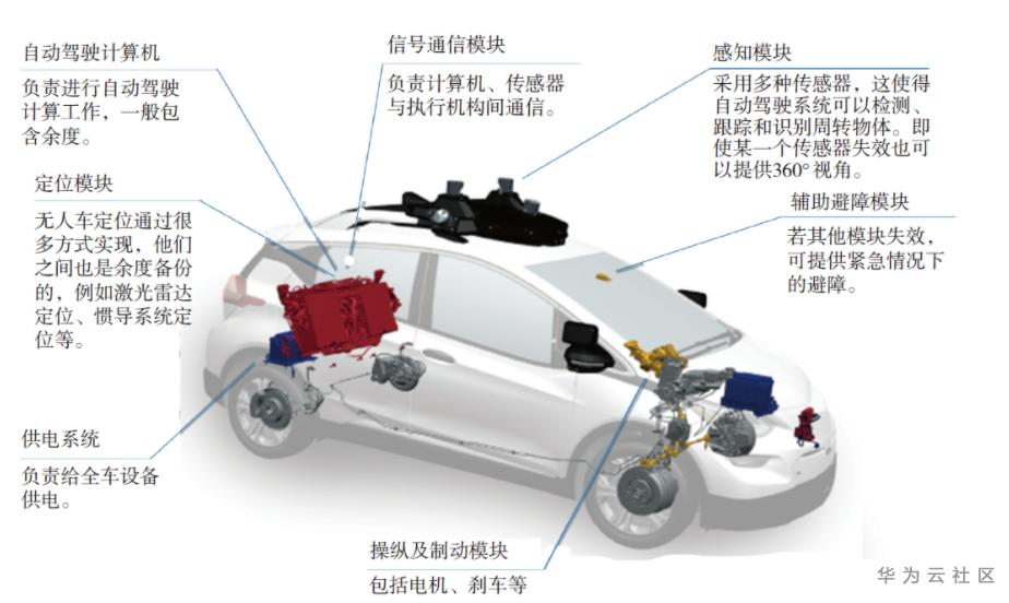 自动驾驶是一个系统性的复杂工作,一般是在传统汽车上进行加装来构建整个系统。下面引用通用汽车公司的Cruise自动驾驶汽车的硬件系统架构进行介绍[8],如图1所示,其他公司方案类似,可以清晰地看出,自动驾驶硬件系统主要包含五部分:感知模块、自动驾驶计算机、供电模块、信号通信模块、执行和制动模块。