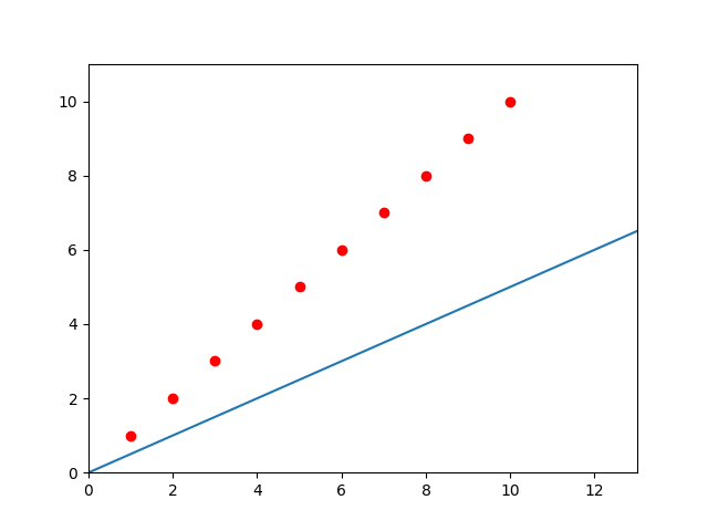import tensorflow as tf import numpy as np import matplotlib.pyplot as plt # Parameters learning_rate = 0.05 training_epochs = 2000 display_step = 50 # Training Data train_X = np.asarray([5.0, 6.0, 7.0, 8.0, 9.0, 10.0, 11.0, 12.0, 13.0, 14.0]) train_Y = train_X - 4 paint_X = np.asarray([-100.0, 100.0]) n_samples = train_X.shape[0] # tf Graph Input X = tf.placeholder("float") Y = tf.placeholder("float") # Set model weights W = tf.Variable(-10., name="weight") b = tf.Variable(10., name="bias") # Construct a linear model pred = tf.add(tf.multiply(X, W), b) # Mean squared error cost = tf.reduce_sum(tf.pow(pred - Y, 2)) / (2 * n_samples) # Gradient descent optimizer = tf.train.GradientDescentOptimizer(learning_rate).minimize(cost) # Initializing the variables init = tf.global_variables_initializer() # Launch the graph plt.figure() plt.ion() with tf.Session() as sess: sess.run(init) # Fit all training data for epoch in range(training_epochs): for (x, y) in zip(train_X, train_Y): sess.run(optimizer, feed_dict={X: x, Y: y}) # Display logs per epoch step if (epoch + 1) % display_step == 0: c = sess.run(cost, feed_dict={X: train_X, Y: train_Y}) print("Epoch:", '%04d' % (epoch + 1), "cost=", "{:.9f}".format(c), "W=", sess.run(W), "b=", sess.run(b)) plt.axis([0.0, np.max(train_X) + 1, 0.0, np.max(train_Y) + 1]) plt.plot(train_X, train_Y, 'ro', label='Original data') plt.plot(paint_X, sess.run(W) * paint_X + sess.run(b), label='Fitted line') plt.pause(0.001) plt.clf() print("Optimization Finished!") training_cost = sess.run(cost, feed_dict={X: train_X, Y: train_Y}) print("Training cost=", training_cost, "W=", sess.run(W), "b=", sess.run(b), '\n') plt.axis([0.0, np.max(train_X) + 1, 0.0, np.max(train_Y) + 1]) plt.plot(train_X, train_Y, 'ro', label='Original data') plt.plot(paint_X, sess.run(W) * paint_X + sess.run(b), label='Fitted line') plt.pause(10)