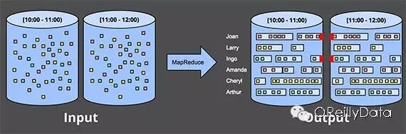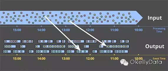 图11:按照事件时间做会话单元的窗口分片。数据按照他们发生的时间以及活动性被分到了不同的会话单元里。白色箭头指出把那些事件时间属于同一个分片的数据放到同一个窗口中去并按事件时间排序。泰勒•阿克道制作。