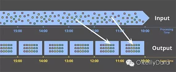 图10:按照事件时间用固定窗口分片。数据按照他们发生的时间收集。白色箭头指出把那些事件时间属于同一个分片的数据放到同一个窗口中去。泰勒•阿克道制作。