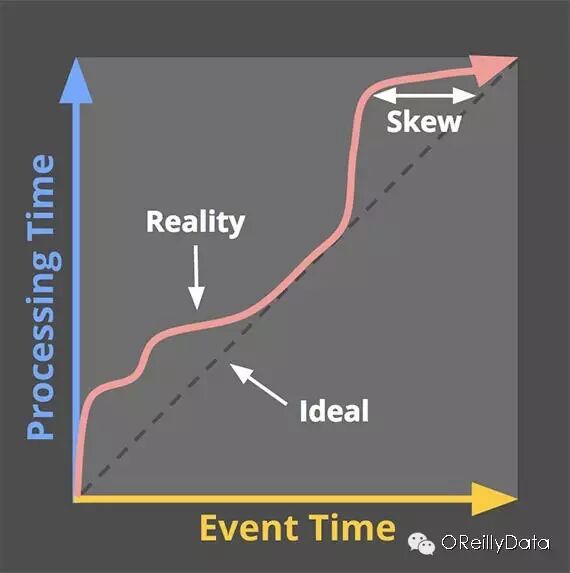 图中,黑色的虚线的斜率是1,代表了理想的情况,即事件时间和处理时间是一样的。红色的线代表现实的情况。在这个例子里,系统在处理时间开始阶段有一些延迟,随后趋于理想状况的同步,最后又产生了一些延迟。在理想情况和实际情况之间的水平距离则代表了处理时间和事件时间之间的偏移。本质上,偏移就是由处理管道产生的延迟。
