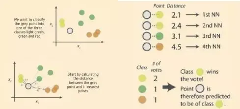 如上图中,对灰色圆点进行分类,划分其属于绿、黄、红何种类型。首先需要计算灰点和近邻电之间的距离,确定其k近邻点,使用周边数量最多的最近邻点类标签确定对象类标签,本例中,灰色圆点被划分为黄色类别。