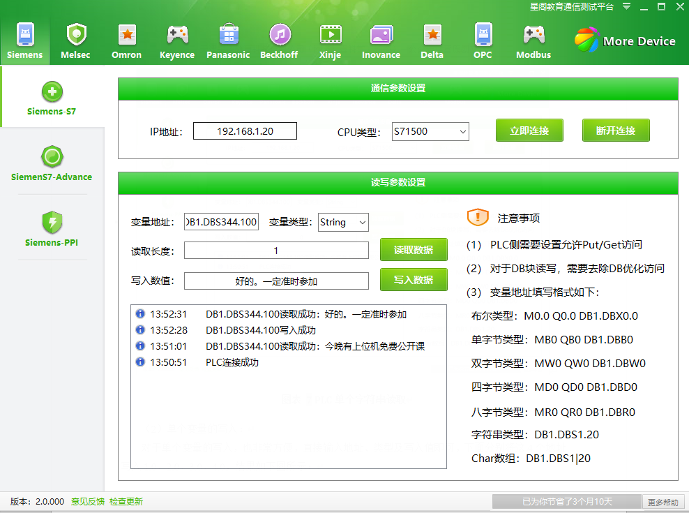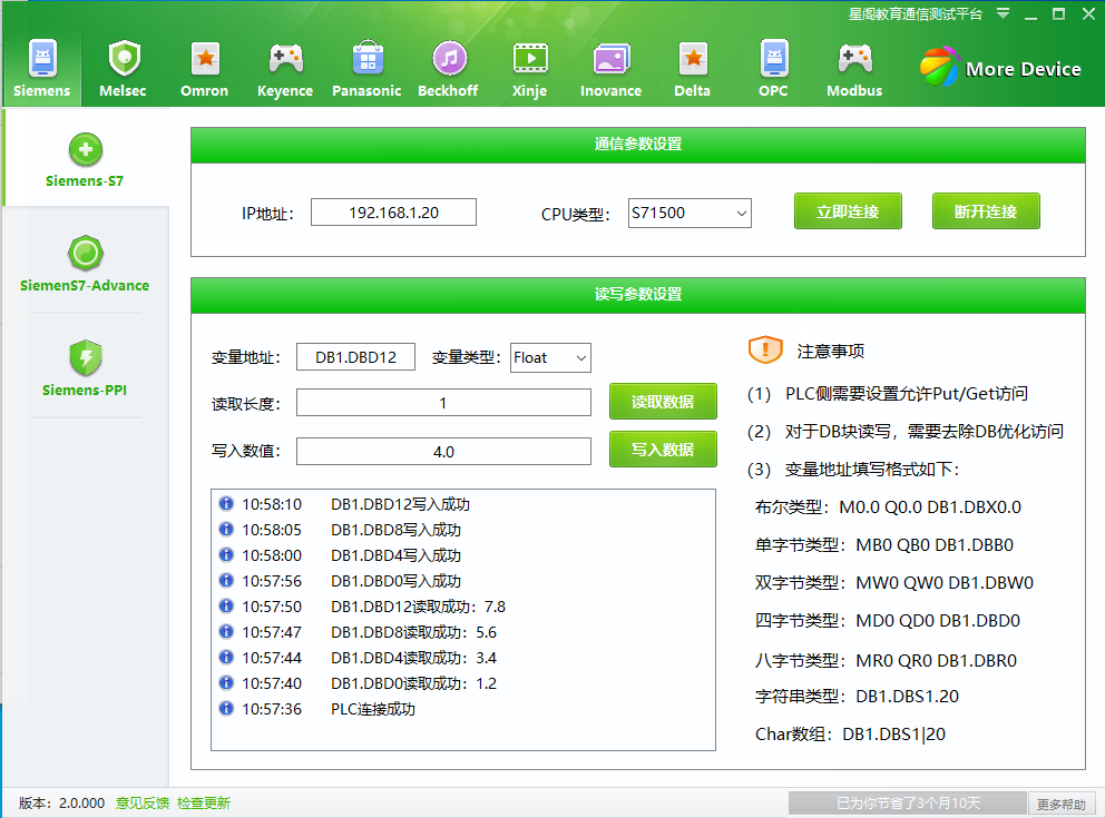 说明:西门子PLC通信只需要IP地址和CPU类型即可,不需要端口号,因为S7协议的端口号是固定值102,之所以要选择CPU类型,是因为不同型号的CPU,握手报文是不一样的。