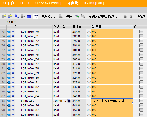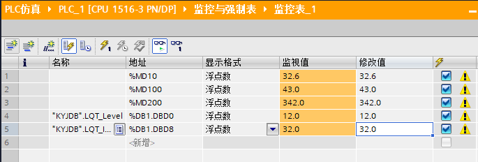 本节中提到的基础通信,主要是指针对PLC的地址进行单个或者多个连续的进行读取及写入,下面直接利用刚刚搭建好的仿真环境来做测试,当然,使用实际PLC也是完全没问题的。前提先将博途中的DB1.DBD0、DB1.DBD4、DB1.DBD8、DB1.DBD12分别改成1.2、3.4、5.6、7.8: