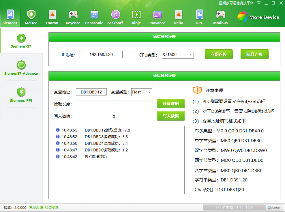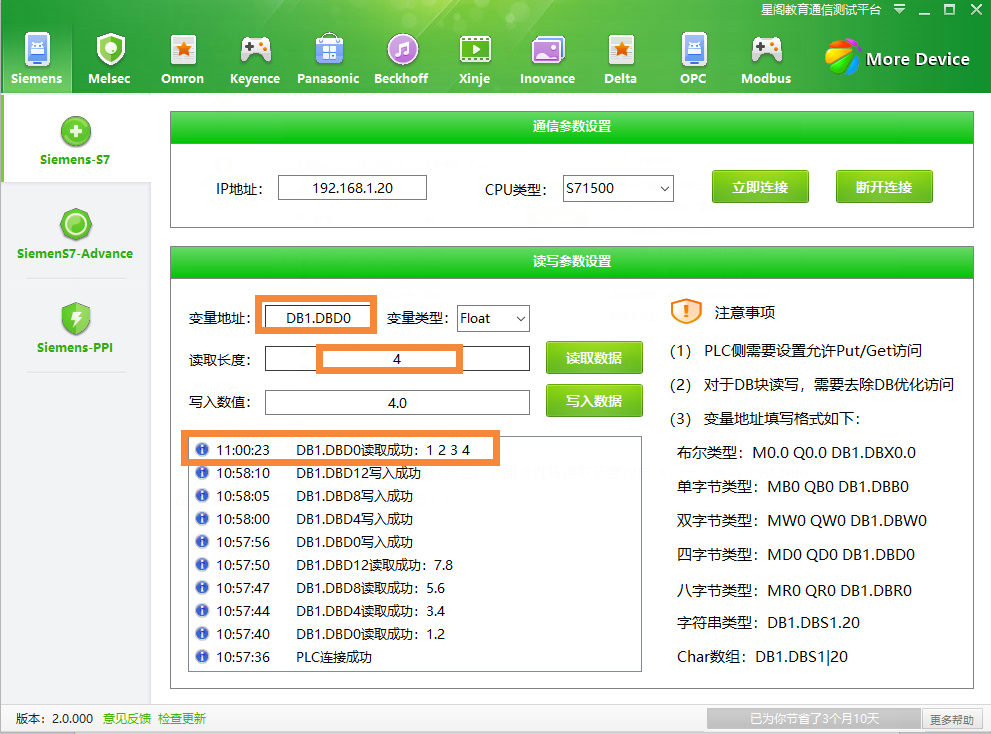 下面以读取MD10、MD100、MD200、DB1.DBD0、DB1.DBD8为例,进行测试,测试结果如下图所示: