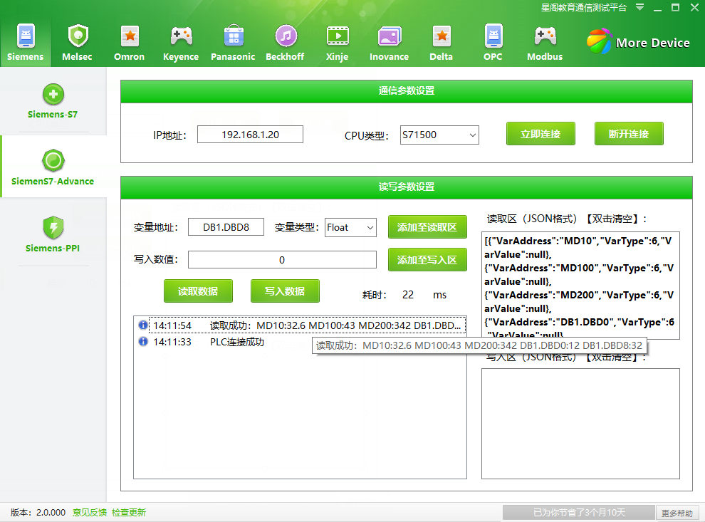 在下图中,连接上PLC后,通过输入变量地址及变量类型,然后点击添加至读取区,会将想要读取的变量加载到右边的读取区中,读取区以JSON形式进行显示,右侧显示耗时时间,添加完成后,通过点击读取数据,会将想要读取的数据展示在日志框中,这些变量是可以不连续的变量。