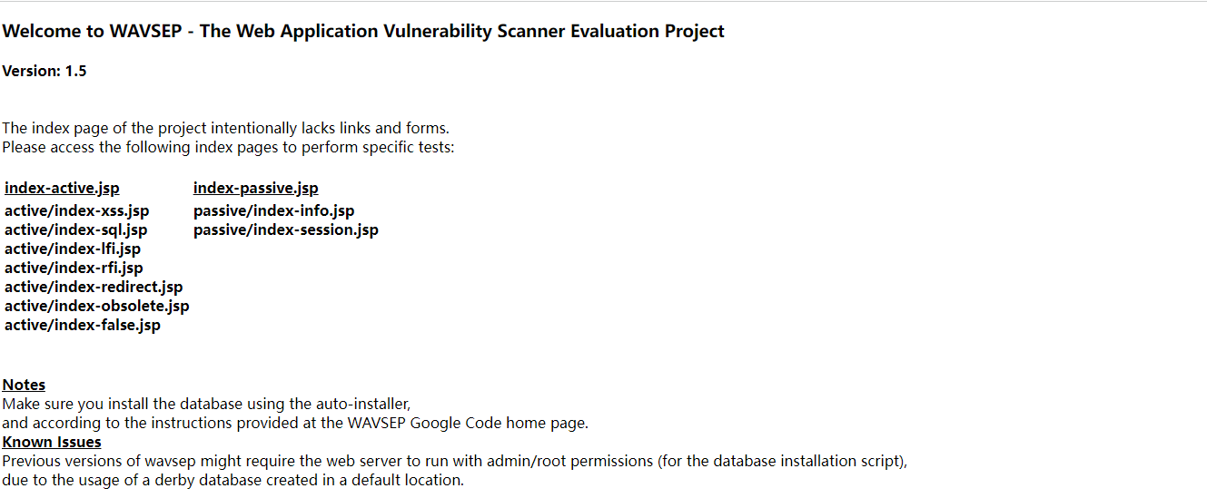 WAVSEP 是经典的漏洞靶场之一,包含常见的Web漏洞(SQL/XSS/Path Travseral/…),包含大量漏洞场景甚至假漏洞(检测扫描器误报率),目前漏洞有