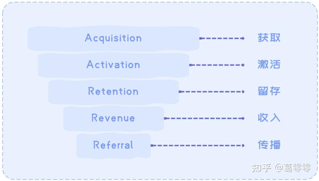 Dave McClure 在2007提出的客户生命周期模型,解释了实现用户增长的5个指标,分别是: