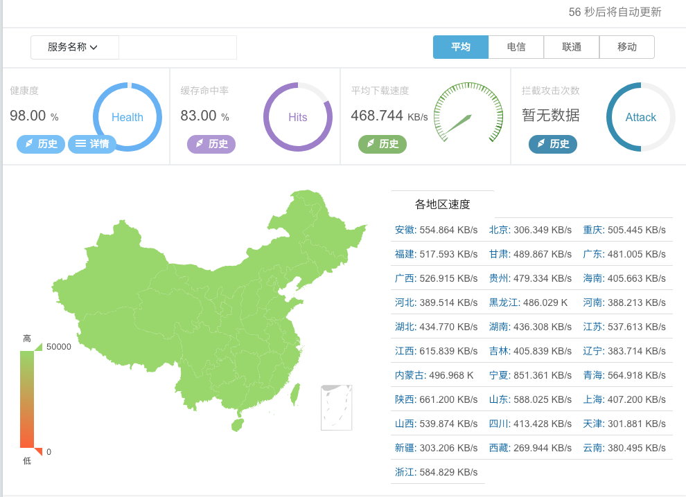 目前,国内的CDN厂商基本都提供检测工具,可以在控制台查看CDN情况的使用情况以及各省份的服务器的下载速率和负载情况,如下图是又拍云的服务监控后台,图中可以看到整体的健康度以及各省份的服务器平均下载速率。