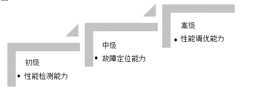 性能测试的目的不仅是为了评估系统当前的性能状况,同时还希望通过故障定位找到系统存在的性能瓶颈,从而进一步优化性能,直接提升系统的处理能力,或者对系统的扩展能力提供优化策略。性能测试工程师的能力可分为三个层次,从初级的性能检测,到中级的故障定位,再到高级的性能调优,是一个循序渐进,逐步提高的过程,下面就这三个层次的能力进行简述。能力层次如下图: