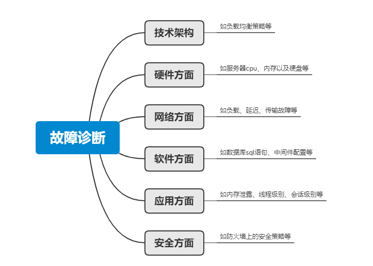 在故障诊断分析方面,当在做性能测试的时候发现系统响应时间过长,没有达到预期的目标,那么就需要分析是什么因素导致了响应慢,是数据库服务器响应慢,还是应用服务器响应慢,如果是数据库服务器响应慢,是因为SQL语句执行时间长引起,还是数据库参数配置不当造成的,这些都是要找出的故障点。故障诊断可以从技术架构、硬件、网络、软件、应用、安全这几个方面展开,如下图: