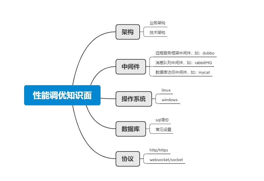 在性能调优知识面,要实现性能调优,需要掌握系统架构、中间件、数据库、操作系统、网络协议等综合知识,如下图: