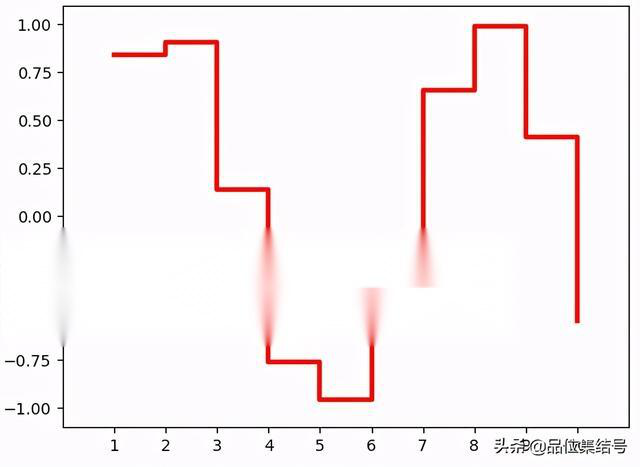 对于阶梯图就不要过多解释了吧,应该大家都很清楚,而且它也是一种很常用的图表,阶梯图就像是台阶一样用上下波动来反映数据的趋势变化或者周期规律,好啦,咱们先暂暂时先不讨论step()函数,还是举个“栗子”来感受一下step()函数的调用方式和绘图效果吧:
