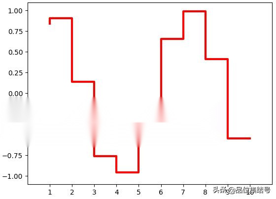 这个函数中第1个参数x_axis和第2个参数y_axis分别代表x轴和y轴的数据,第3个参数color表示颜色,所赋值的‘r’当然是表示red红色, 后面第4个参数where可能大家还比较陌生,那我们就重点说一下吧,where其实是step()函数的关键字参数,其中咱们给它赋的值’pre’表示x轴上的每个数据点对应的y轴上的数值向左侧绘制水平线直到x轴上的此数据点的左侧相邻数据点为止哦,也就是说,x轴上的相邻数据点取值是按照所谓的左开右闭的区间进行数据点选取的哦,这一点大家要记住