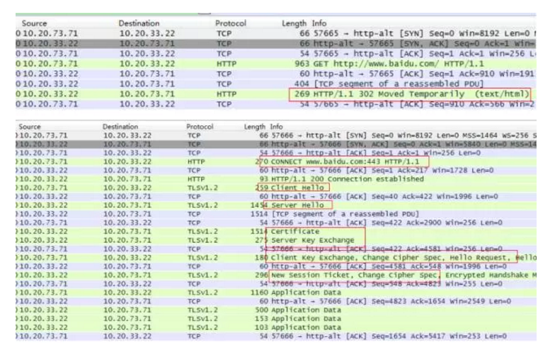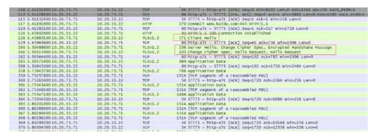 由于小区网关设置了代理访问,因此,在进行https访问的时候,客户端需要和代理机做”HTTPS CONNECT tunnel” 连接(关于”HTTPS CONNECT tunnel”连接,可以理解为:虽然后续的https请求都是代理机和百度服务器进行公私钥连接和对称密钥交换,以及数据通信;但是,有了隧道连接之后,可以认为客户端也在直接和百度服务器进行通信。)