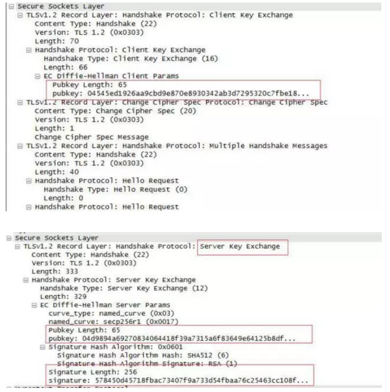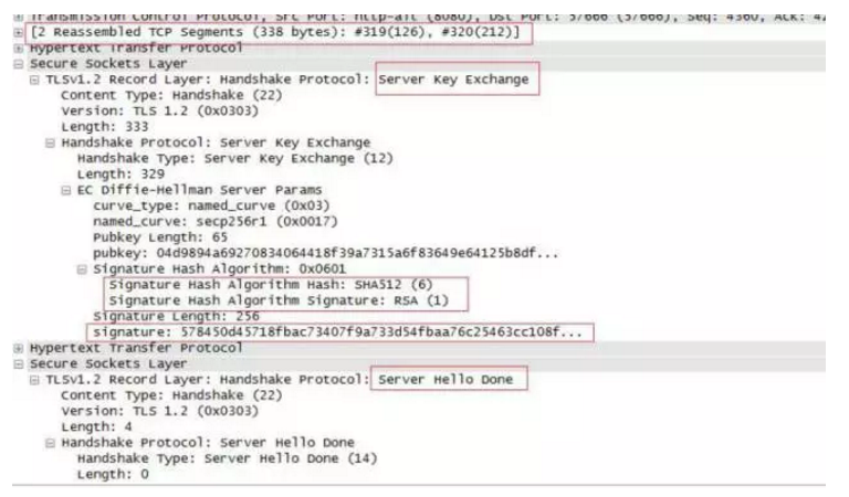 我们抓的包是将 Server Hello Done 和 server key exchage 合并的包: