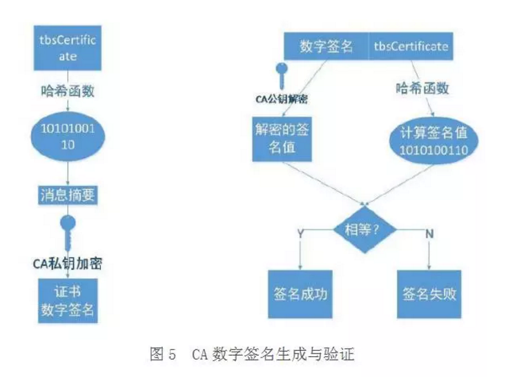 2、数字签名的校验。使用CA的公钥解密签名,然后使用相同的签名函数对签名证书内容进行签名,并和服务端数字签名里的签名内容进行比较,如果相同就认为校验成功。