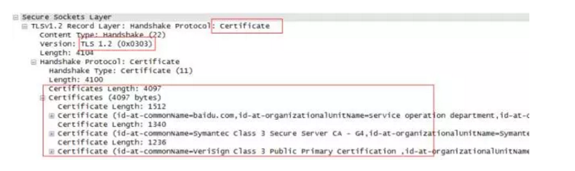 在前面的https原理研究中,我们知道为了安全的将公钥发给客户端,服务端会把公钥放入数字证书中并发给客户端(数字证书可以自签发,但是一般为了保证安全会有一个专门的CA机构签发),所以这个报文就是数字证书,4097 bytes就是证书的长度。