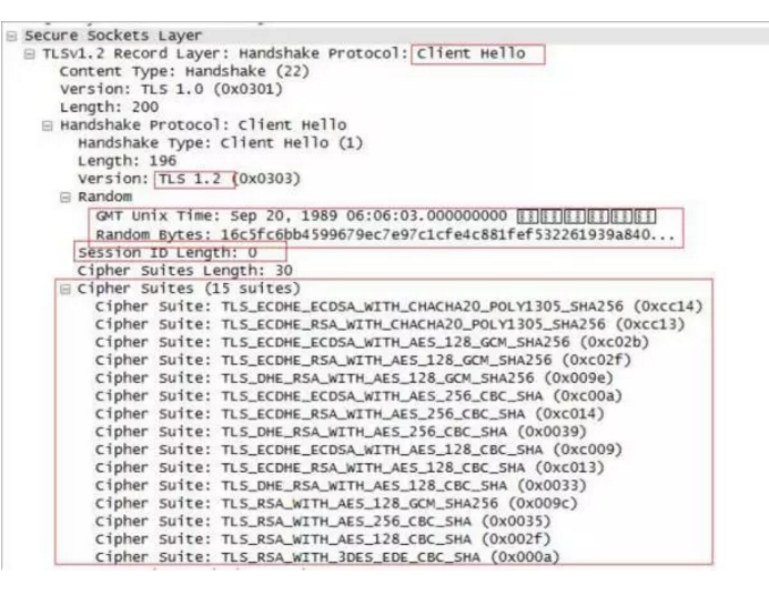 在客户端问候中,有四个字节以Unix时间格式记录了客户端的协调世界时间(UTC)。协调世界时间是从1970年1月1日开始到当前时刻所经历的秒数。在这个例子中,0x2516b84b就是协调世界时间。在他后面有28字节的随机数(random_C),在后面的过程中我们会用到这个随机数。