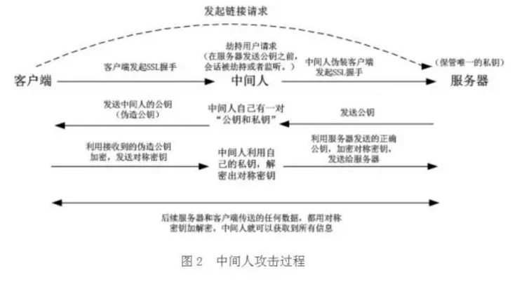 但是这样似乎还不够,如果通信过程中,在三次握手或者客户端发起HTTP请求过程中,客户端的请求被中间人劫持,那么中间人就可以伪装成“假冒客户端”和服务器通信;中间人又可以伪装成“假冒服务器”和客户端通信。接下来,我们详细阐述中间人获取对称密钥的过程: