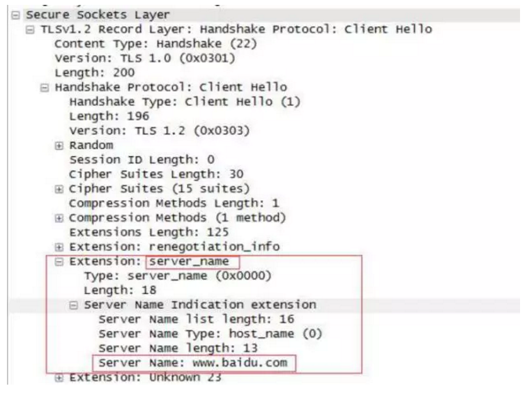 当我们去访问一个站点时,一定是先通过DNS解析出站点对应的ip地址,通过ip地址来访问站点,由于很多时候一个ip地址是给很多的站点公用,因此如果没有server_name这个字段,server是无法给与客户端相应的数字证书的,Server_name扩展则允许服务器对浏览器的请求授予相对应的证书。