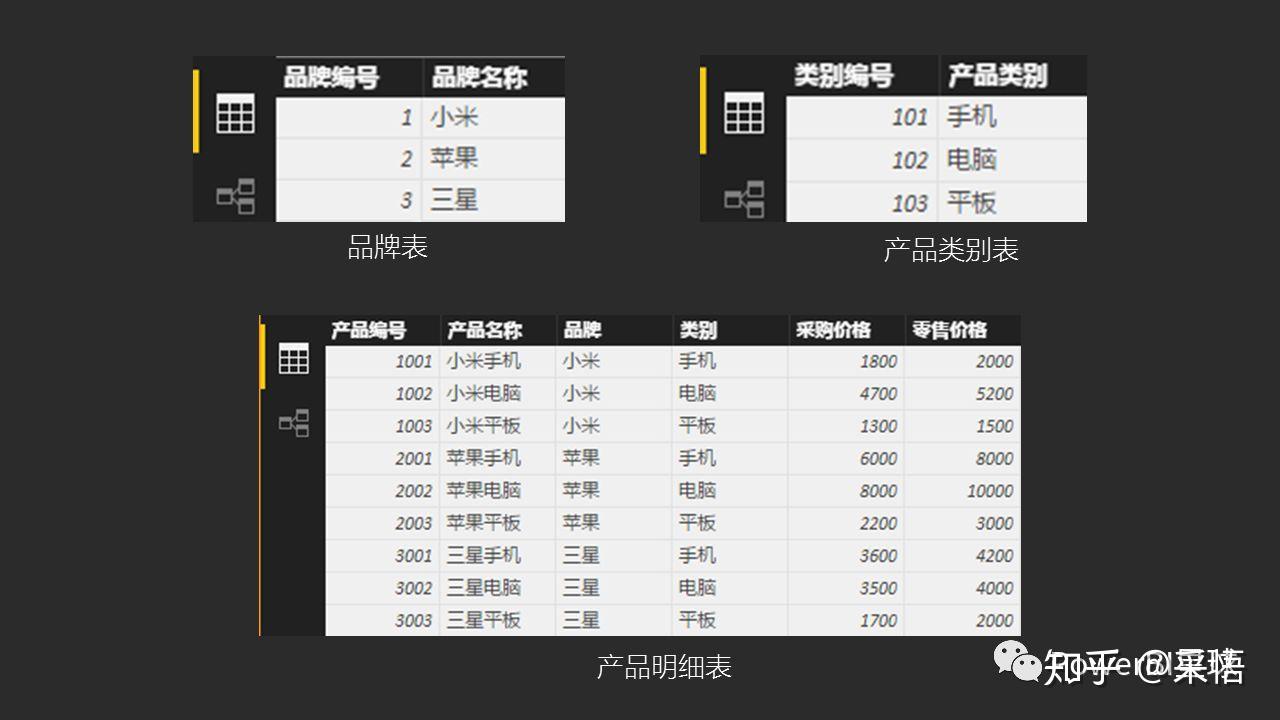 为了能分析每个品牌的销售金额,或者分析每个产品类别的销售情况,其实还应该设计个产品明细表以及对应的品牌表和种类表,像这样的: